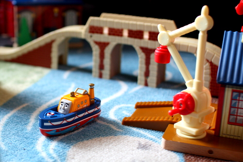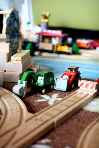One of my son’s favorite parts of this layout we made on our rugs is the “dirt” area, with Alfie (the excavator) and Jack (the front loader).  I put a stack of building blocks there and a track that engines can back freight cars down to be loaded with dirt, and these two characters who usually get ignored at our house have been very busy this week.