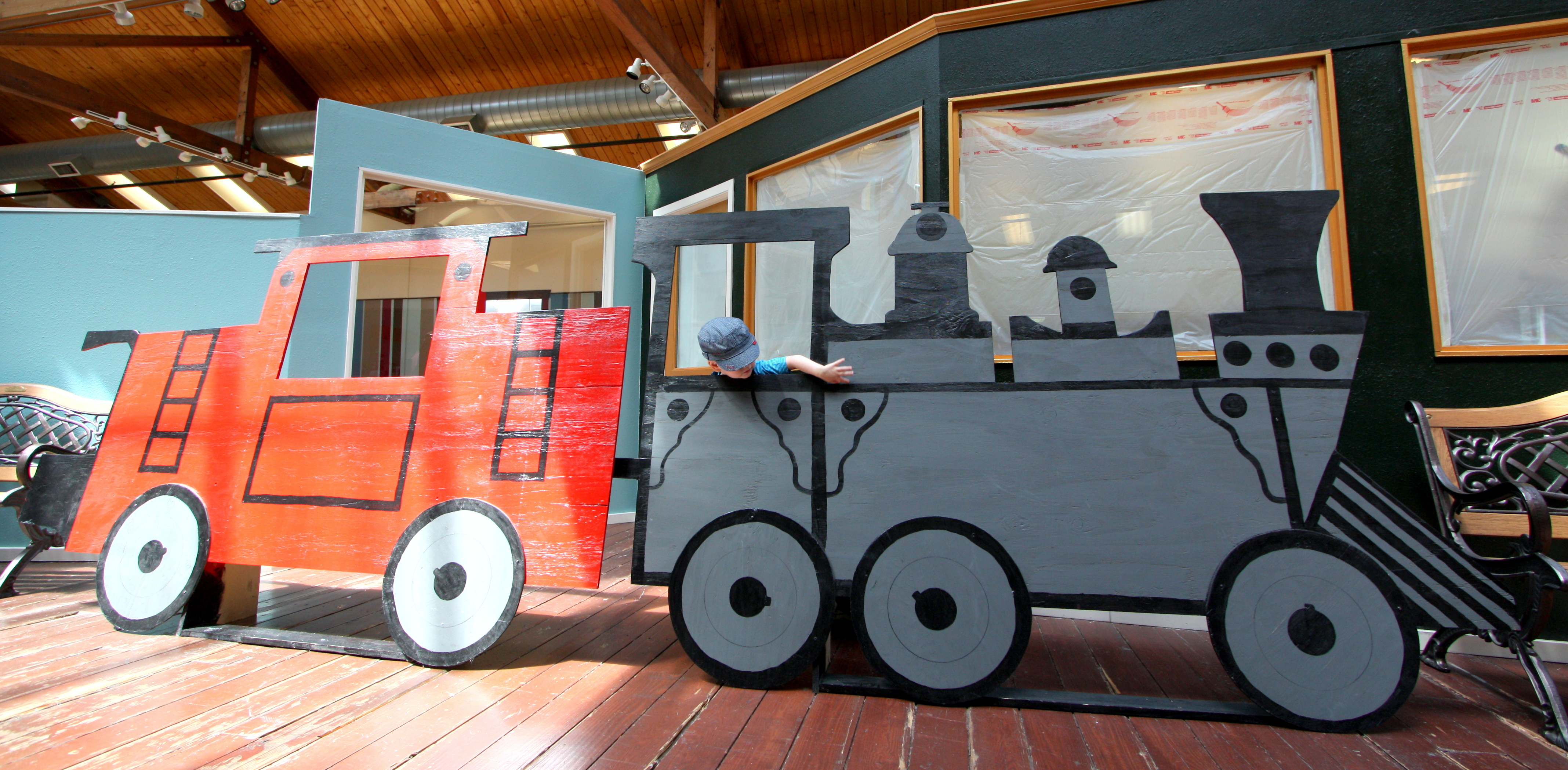 They had this cool wooden train cutout for taking pictures, though the only reason we got it all in one shot there in the hallway was our super wide lens. He had a look around at all the trains. The hand stamps were made with a Thomas-shaped stamp, and the Little Engineer allowed someone to stamp his hand for the first time ever. We found every single piece of Thomas the Tank Engine merchandise offered for sale. It was fun to look at some of the Thomas & Friends model trains in person again in one vendor’s booth. And for lunch afterwards, Freighthouse Square had a wide variety of tasty options in their food court.